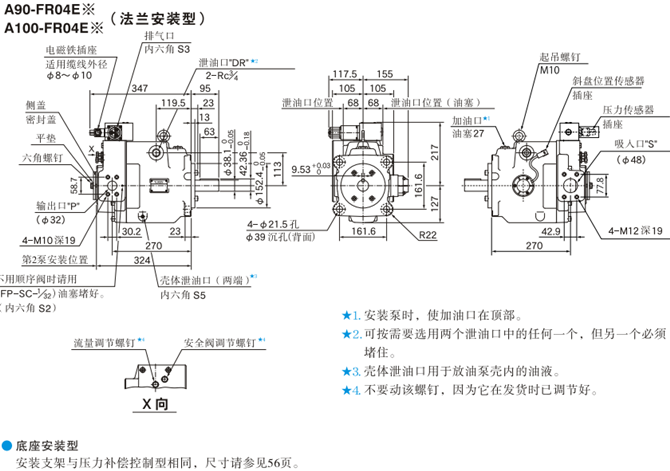 A90-FR04E※(法蘭安裝型)/A100-FR04E※(法蘭安裝型)油研柱塞泵安裝尺寸圖: